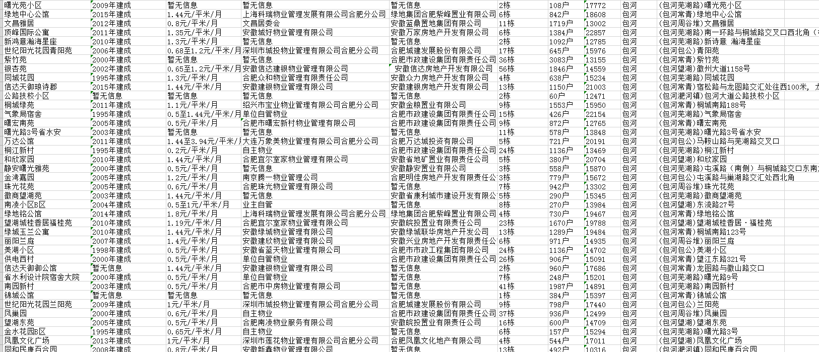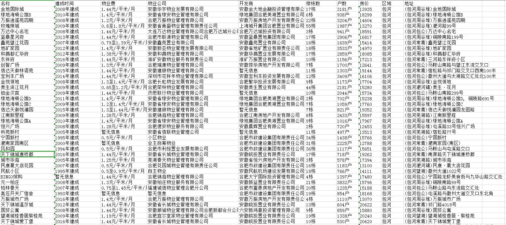 今天小采給大家?guī)?lái)的數(shù)據(jù)福利就是合肥地區(qū)內(nèi)3300的小區(qū)的數(shù)據(jù)信息,包含有小區(qū)的名稱、建成時(shí)間,小區(qū)物業(yè)費(fèi)收費(fèi)標(biāo)準(zhǔn)、所屬的物業(yè)公司及開(kāi)發(fā)商、小區(qū)的棟數(shù)、戶數(shù)、地理位置和當(dāng)下的房?jī)r(jià)。
