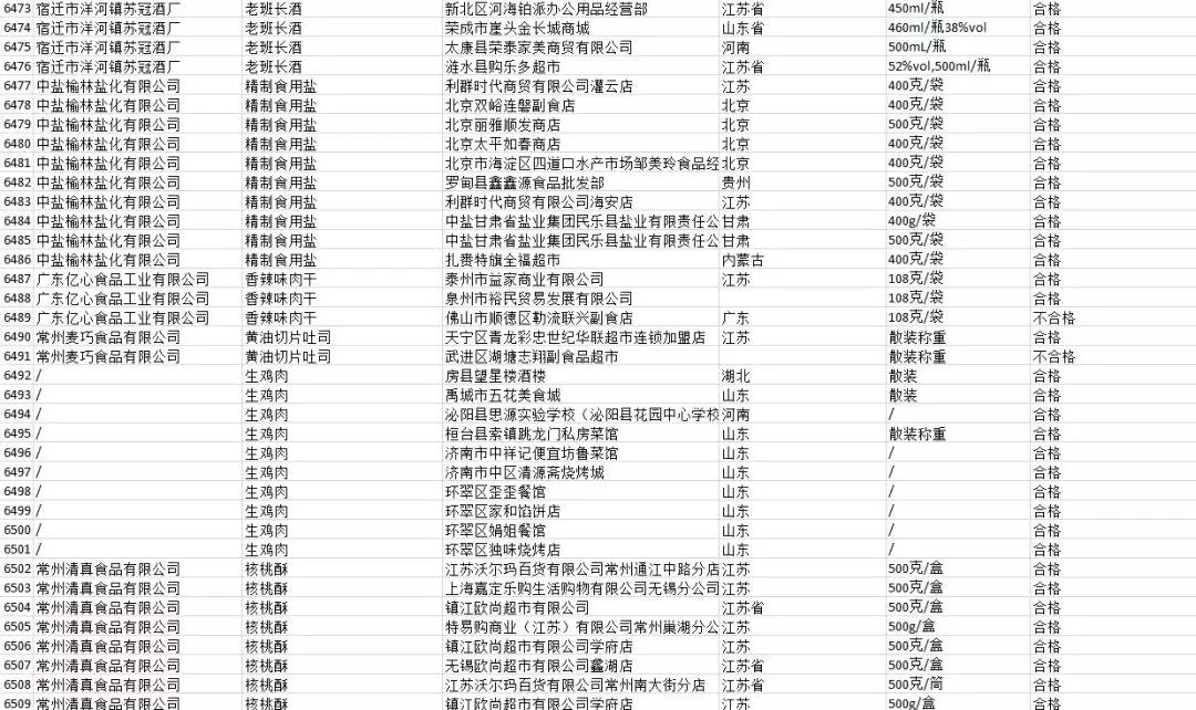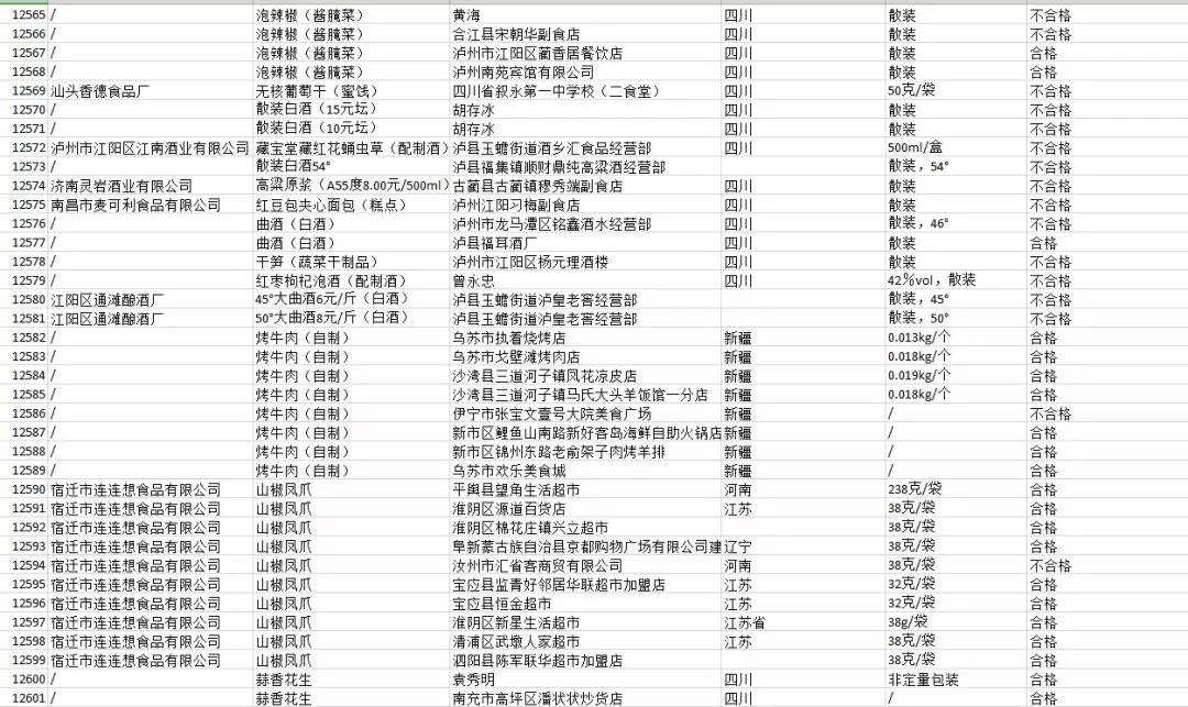 數(shù)據(jù)包括生產(chǎn)企業(yè)名稱、食品名稱、被抽檢單位名稱、抽檢單位所在省份、規(guī)格型號以及抽檢的結(jié)果。
